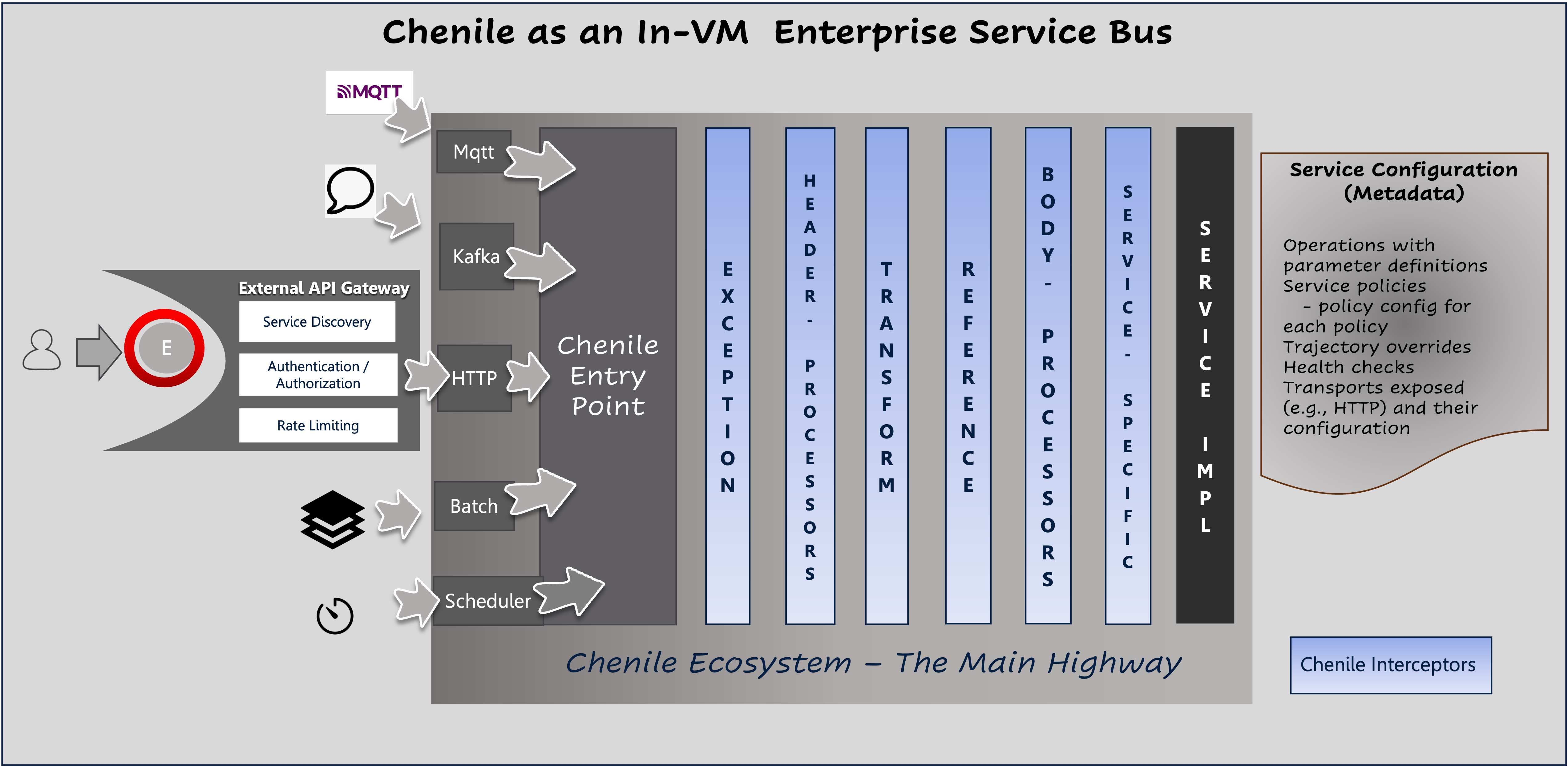 Chenile started out as an embedded Enterprise Service Bus (ESB). The idea was to de-couple service functionality from transports. Services implement functionality. Trasports merely expose the services to the outside world. Our services can be invoked via HTTP, Kafka, MQ, MQ-TT etc. without any changes to the central infrastructure code. Chenile provides an ability to do last-mile interception. This de-couples horizontal concerns from functionality. Last mile interception allows orgs to push a lot of horizontal functionality (such as routing, caching, logging, auditing etc.) out of services without needing to invest in expensive customization in the API Gateway layer. Chenile does recommend a robust API Gateway as an excellent upstream interception layer for HTTP requests to access the services. However, it is hard to customize API Gateways. Further, API Gatewys are mostly fine-tuned for HTTP. What if you want to implement caching across transports? In addition to that, certain concerns such as transformation must be handled close to the services and therefore make an excellent concern that could be implemented in the last mile.We wanted to make this last-mile interception work in a transport agnostic manner i.e. it should work across HTTP, KAFKA, message queues etc. By doing so, we wanted to re-use the pipeline across transports.